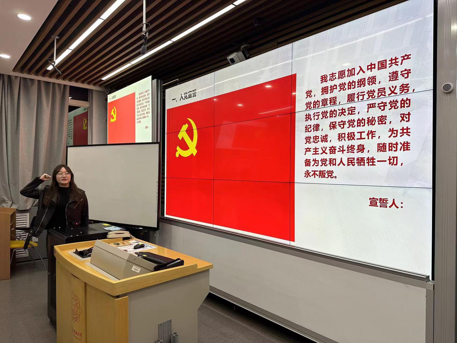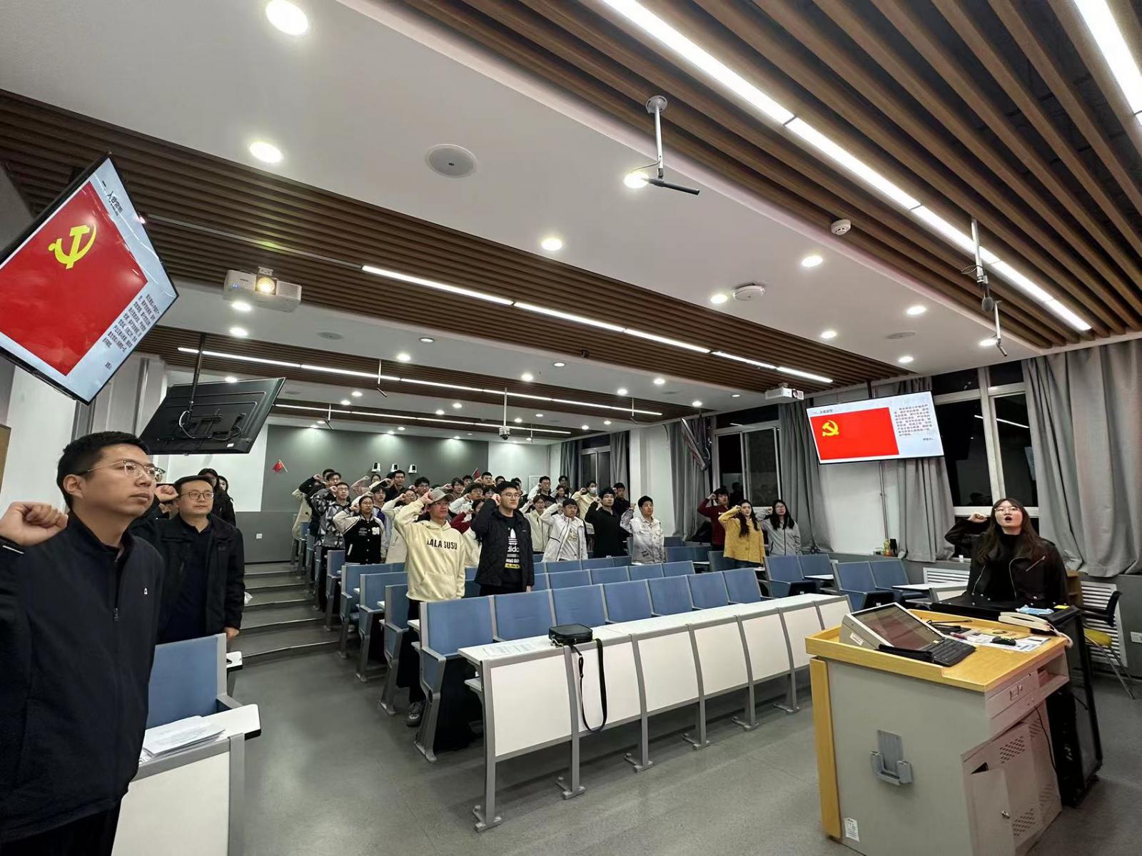 白揚華宣讀預備黨員名單,并對新入黨的同志表示熱烈的祝賀,他強調黨員同志要牢記入黨誓詞,堅持全心全意為人民服務的宗旨,努力學習科學文化知識,增強建設祖國的本領。2021級本科生孫鈺軒隨后領誓,全體黨員面向黨旗,緊握右拳,莊嚴宣誓。白揚華做總結發言,他強調預備黨員宣誓儀式體現了入黨的莊重性和嚴肅性,是對預備黨員進行教育的一種形式,也是增強黨性觀念,向黨莊嚴表示為共產主義事業獻身的堅定決心。新入黨的同志要端正入黨動機,真正做到組織上入黨與思想上入黨的有機統一;堅定理想信念,增強黨性修養,時刻規范自己言行;理論聯系實際,做到知行合一,充分發揮黨員先鋒模范帶頭作用。