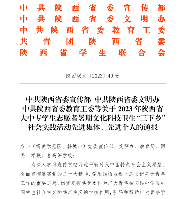 電子工程學院暑期社會實踐團隊榮獲陜西省“三下鄉”社會實踐活動優秀團隊