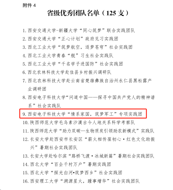 通訊員 畢力格 楊笑宇)近日,由省委宣傳部、省委文明辦、省教工委、團省委、省學聯等單位組織的 2023 年陜西省大中專學生志愿者暑期文化科技衛生“三下鄉”社會實踐活動先進集體評選結果揭曉,電子工程學院“情系家國,筑夢軍工”專項實踐團獲得省級優秀團隊榮譽稱號。