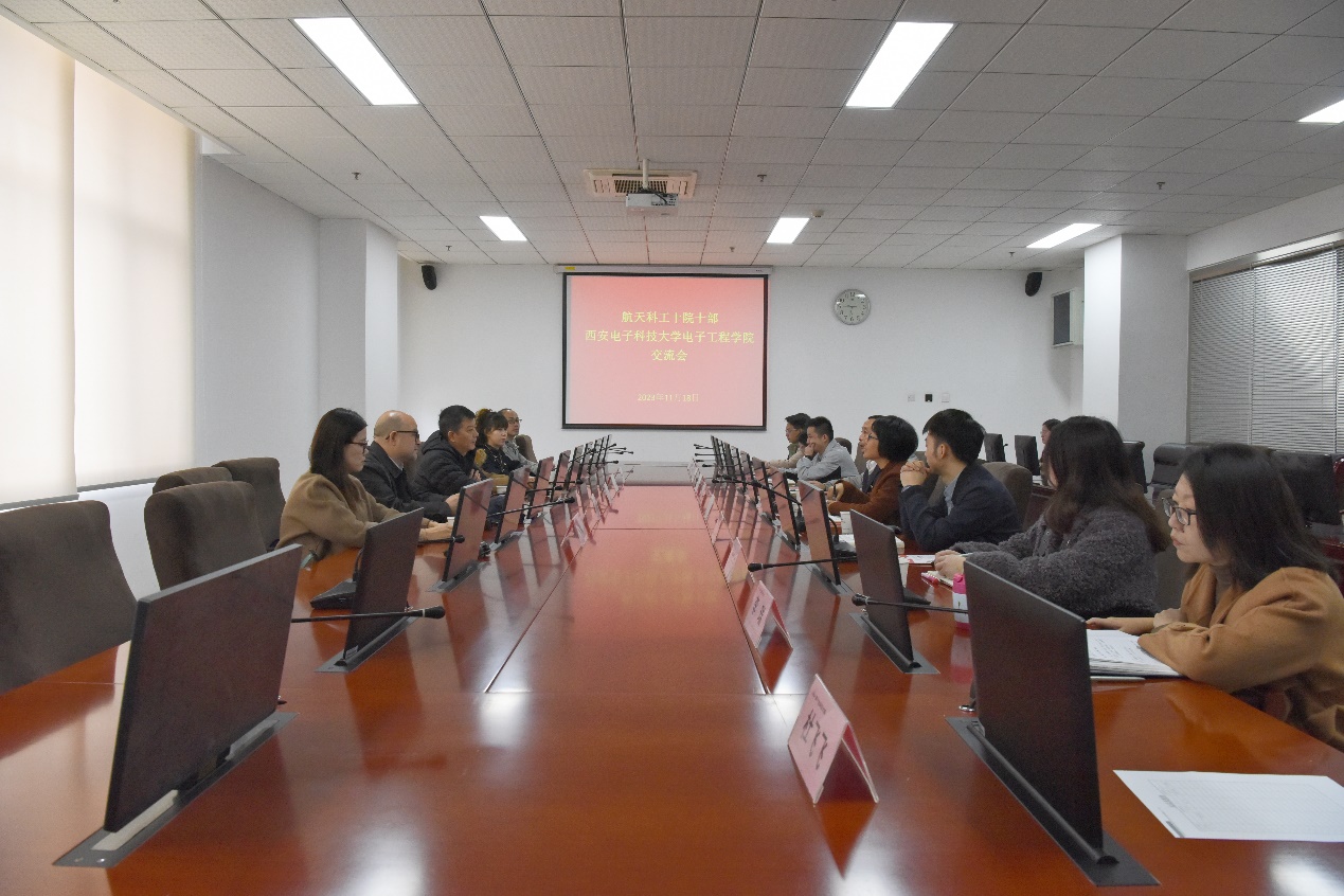 在與中國航天科工集團第十研究院第十總體設計部的座談中,雙方深入探討黨建引領、人才培養、科學研究、實習就業等方面合作。楊光暐表示,希望未來雙方加強戰略合作和校企聯動,探索符合產業和行業需求的人才自主培養模式,同時學院要繼續強化就業引領,服務國家戰略需求,引導學生到國家重點單位、重點崗位實踐鍛煉。航天科工十院十部黨委副書記田安貴講到,西電電子工程學院的學科專業優勢和人才培養特色與十院十部高度契合,雙方黨委要探索建立長效合作機制,堅持“四個面向”加速科技成果向現實生產力轉化,確保戰略合作落實落地。