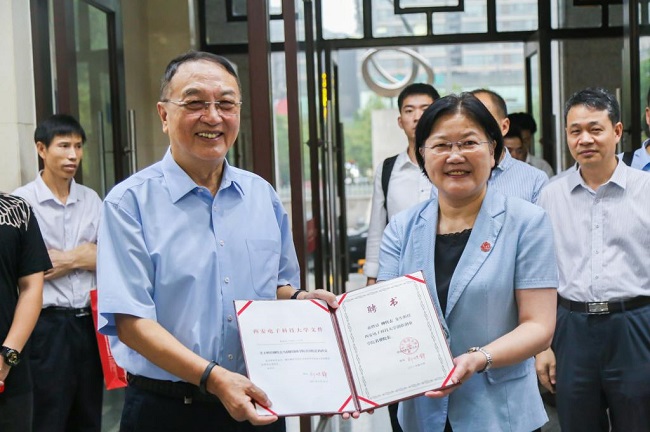 在近百名西電師生的見證下,龍建成宣讀了聘任柳傳志為西安電子科技大學創新創業學院名譽院長的文件,鄭曉靜為他頒發聘任證書并佩戴校徽。