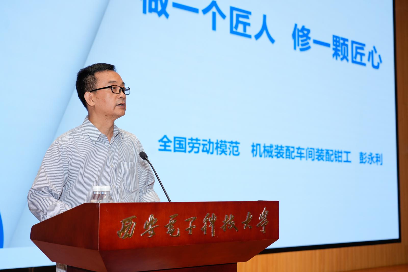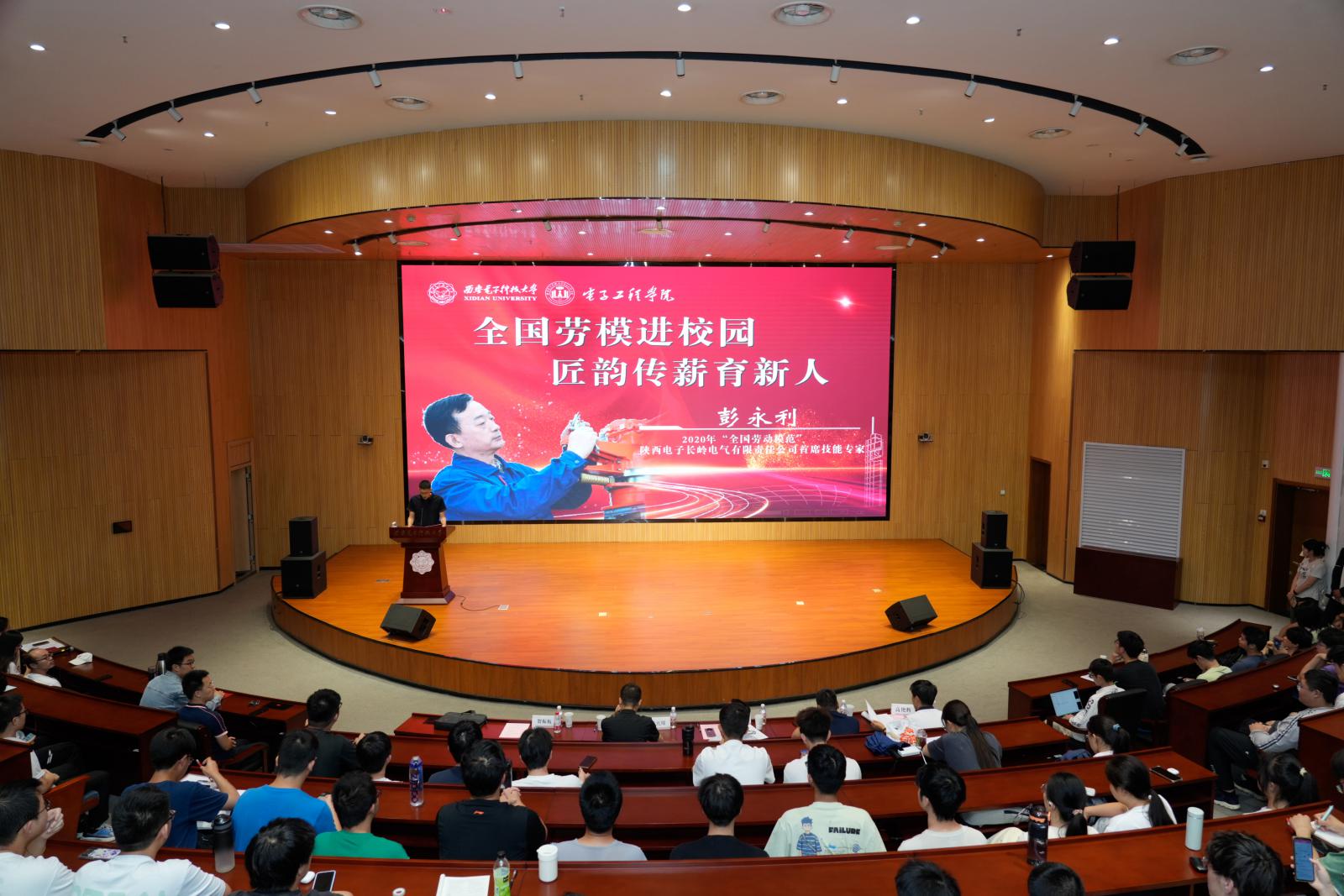 西電電院網訊(通訊員張偉)5月28日下午,電子工程學院在南校區會議中心舉辦“全國勞模進校園 匠韻傳薪育新人”主題活動,邀請“全國勞動模范”、陜西電子長嶺電氣有限責任公司首席技能專家彭永利作主題報告。電子工程學院黨委書記楊光暐,陜西電子長嶺電氣有限責任公司副總經濟師、人力資源部部長南衛東,人事科科長高艷輝,以及學院輔導員和400余名本科生參加活動。報告會由學院黨委副書記賀振航主持。