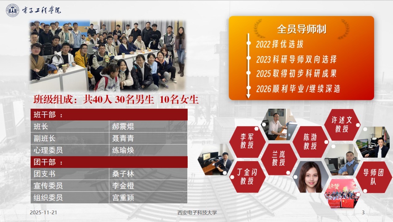 班級匯聚了來自直接選拔與分流考試頂尖學子的智慧與力量。入學后,班級同學100%加入雷達信號處理全國重點實驗室,提前投身科研實踐。目前已有20余人在科研實訓中產出有效成果,并發表SCI/EI論文3篇,展現出強大的科研潛力和創新活力。