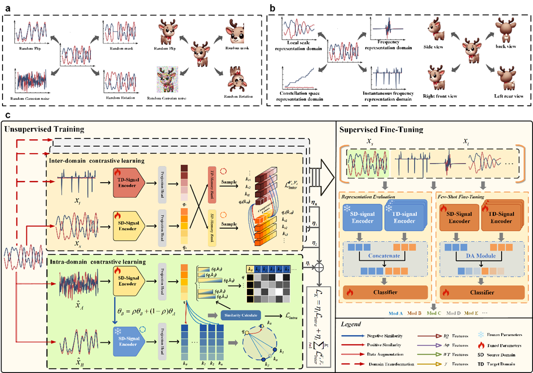 該框架的核心創新在于,對原始信號及其數據增強版本,以及在多個不同表征域中分別構建特征字典,進行域內和域間的對比學習。在無標注的條件下有效挖掘不同表征域之間域不變調制特征,同時保留信號中的固有信息。團隊創新性地將表征域的有效性選擇從信號層面提升到了更精細的特征層面,顯著提升了特征提取的效率和判別能力。