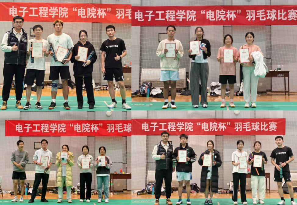 經過兩天激烈角逐,最終男子單打冠軍由來自2022級崔鑫元同學奪得,女子單打冠軍由2023級李伊諾同學獲得。男雙、女雙冠軍分別為2023級王榮博、王禹憧組合和2024級譚佳楨、2023級張馥麟組合,混合雙打項目的冠軍則由2024級的一對新生組合穆炳叡、劉昕羽摘得。賽后,電子工程學院本科2022級輔導員為獲獎選手頒獎。