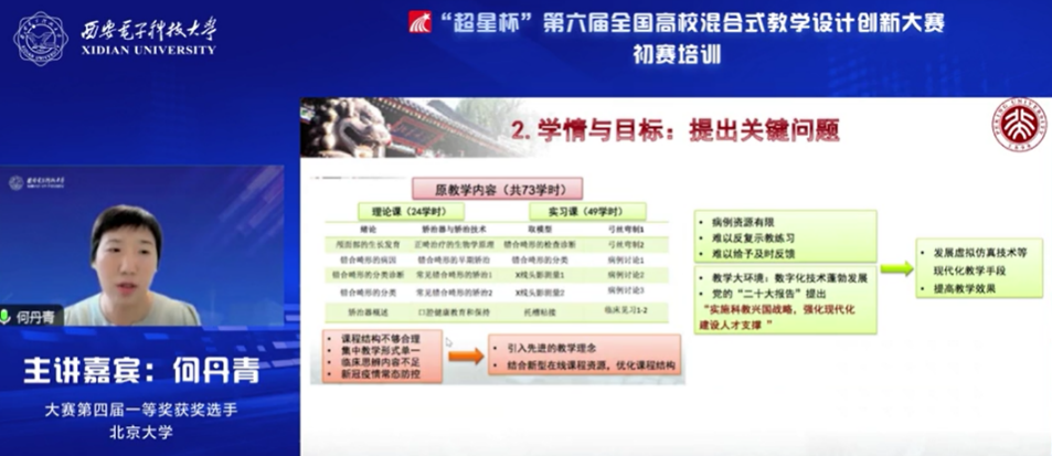 6月28日,大賽專家委員會主任、國家級教學名師、西安電子科技大學劉三陽教授結合大賽章程和個人教學經驗,對大賽賽制賽程、評審標準進行了詳細解讀與分析,向參賽教師強調了提交材料的注意事項及專項獎要求,指導參賽教師更好地備賽。大賽第四屆一等獎獲獎選手、北京大學何丹青副教授以“傳承與創新”為主題,以《口腔正畸學》課程為例,進行了參賽經驗分享。大賽第五屆特等獎獲獎選手、華南師范大學詹瑩瑩副教授分享了人文通識課程的混合式教學探索與實踐。本場報告會由大賽專家委員會副主任、西安電子科技大學本科生院常務副院長、教務處處長蘇濤主持。