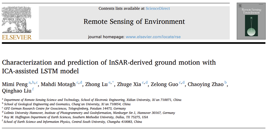 (通訊員問穎潔)近日,西安電子科技大學電子工程學院遙感科學與技術系青年教師彭米米與美國南衛理公會大學路中教授以及德國地學研究中心Mahdi Motagh教授合作在遙感領域頂級期刊《Remote Sensing of Environment》環境遙感(RSE)發表了題為《Characterization and prediction of InSAR-derived ground motion with ICA-assisted LSTM model》的最新研究成果。RSE被公認為遙感領域內頂級學術期刊,中科院SCI一區TOP,最新影響因子(IF)為13.5,在全球遙感類SCI學術期刊中長期排名第一,具有廣泛而深遠的國際影響力。