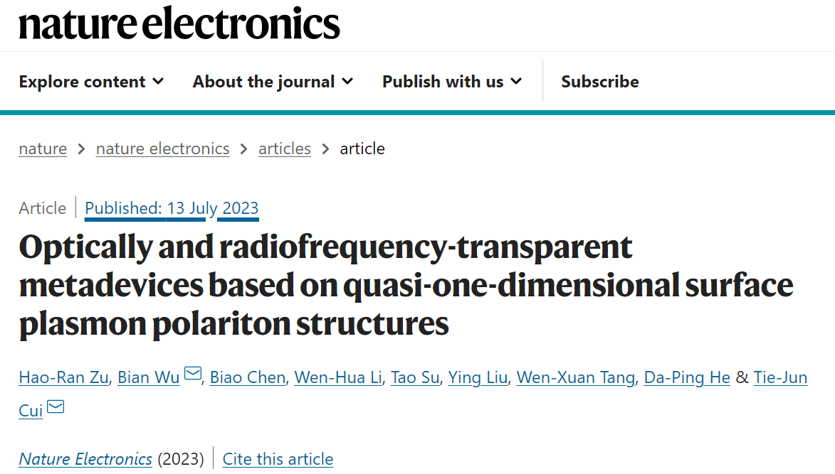 (西電新聞網訊)近日,西電電子工程學院天線與微波技術重點實驗室吳邊教授團隊在準一維表面等離激元光學與射頻雙透明電磁器件方面取得突破性進展,研究成果以《Optically and radiofrequency-transparent metadevices based on quasi-one-dimensional surface plasmon polariton structures》”為題發表在《自然?電子》(Nature Electronics)。西電祖浩然博士為論文第一作者,吳邊教授和東南大學崔鐵軍院士為論文通訊作者,西電蘇濤教授、劉英教授也參與了該工作,西安電子科技大學為論文第一單位。