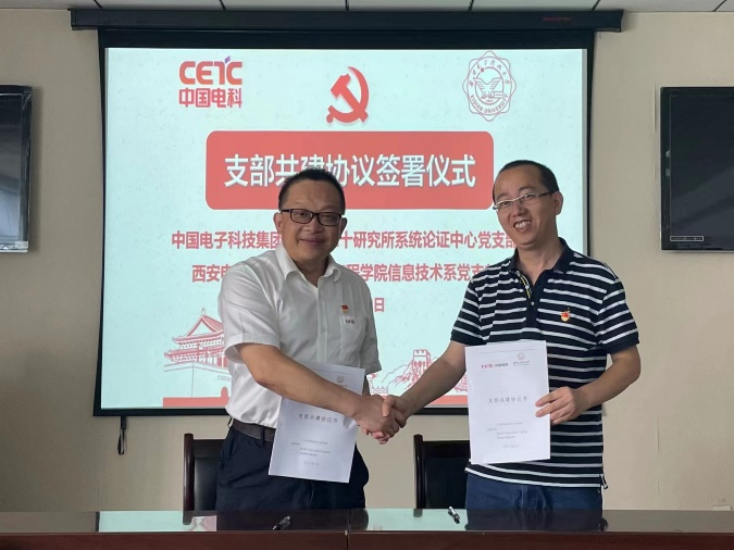 (通訊員董陽陽)為深入學習貫徹黨的二十大精神,加強基層黨組織建設,充分發揮黨建引領作用,2023年8月10日上午中國電子科技集團公司第二十研究所系統論證中心黨支部(20所系統論證中心黨支部)與西安電子科技大學電子工程學院信息技術系黨支部(信息技術系黨支部)在北校區新科技樓702會議室召開支部共建會議。20所系統論證中心黨支部張文祥書記一行5人,信息技術系黨支部書記湯建龍及全體支委5人參加會議。會議由湯建龍主持。