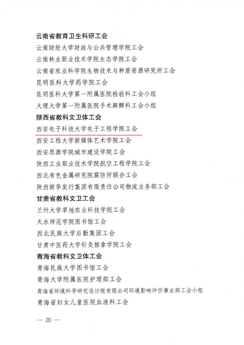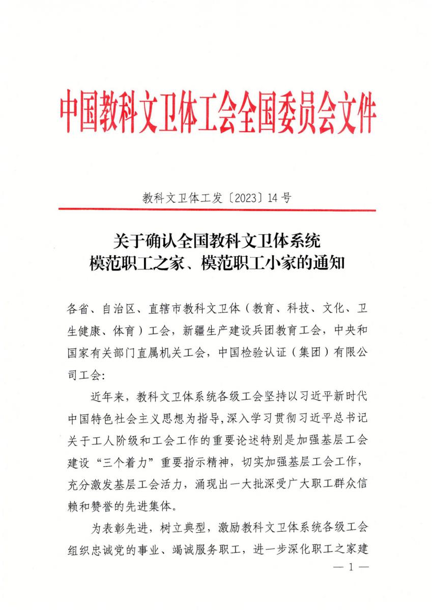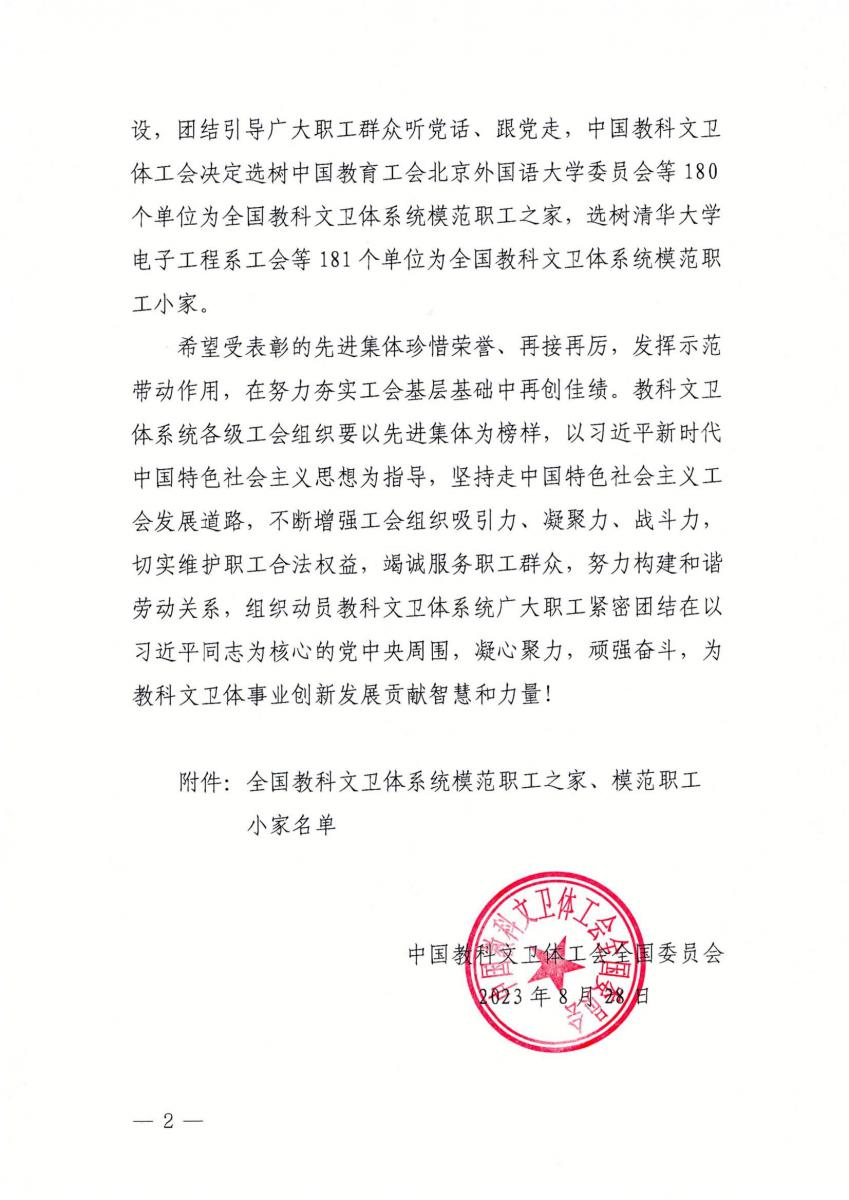 (通訊員劉昕雨)近日,中國教科文衛體工會全國委員會下發了《關于確認全國教科文衛體系統“模范職工之家”“模范職工小家”的通知》(教科文衛體工發[2023]14號),電子工程學院工會獲得全國教科文衛體系統“模范職工小家”稱號。