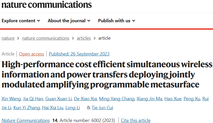 X. Wang, J. Q. Han, G. X. Li, D. X. Xia, M. Y. Chang, X. J. Ma, H. Xue, P. Xu, R. J. Li, K. Y. Zhang, H. X. Liu, L. Li, T. J. Cui, High-performance cost efficient simultaneous wireless information and power transfers deploying jointly modulated amplifying programmable metasurface. Nat. Commun. 14, 6002 (2023).