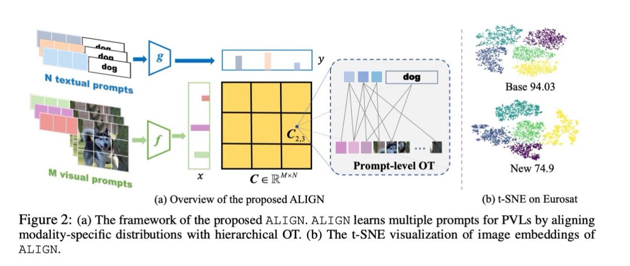 王東升的論文《Tuning Multi-mode Token-level Prompt Alignment across Modalities》探索形成了一種用于多模態提示學習的新范式,并提出一種新穎的token級別的模態對齊方法。文章將圖像及其標簽建模為隱空間的離散分布,同時考慮層次化的表示學習,通過引入全局和局部最優傳輸理論實現圖像-文本模態對齊,然后可視化展示學到的轉移矩陣,文章直觀地展示了模型學習的對齊關系。大量實驗結果證明所提方法在多種任務場景下達到了sota結果。