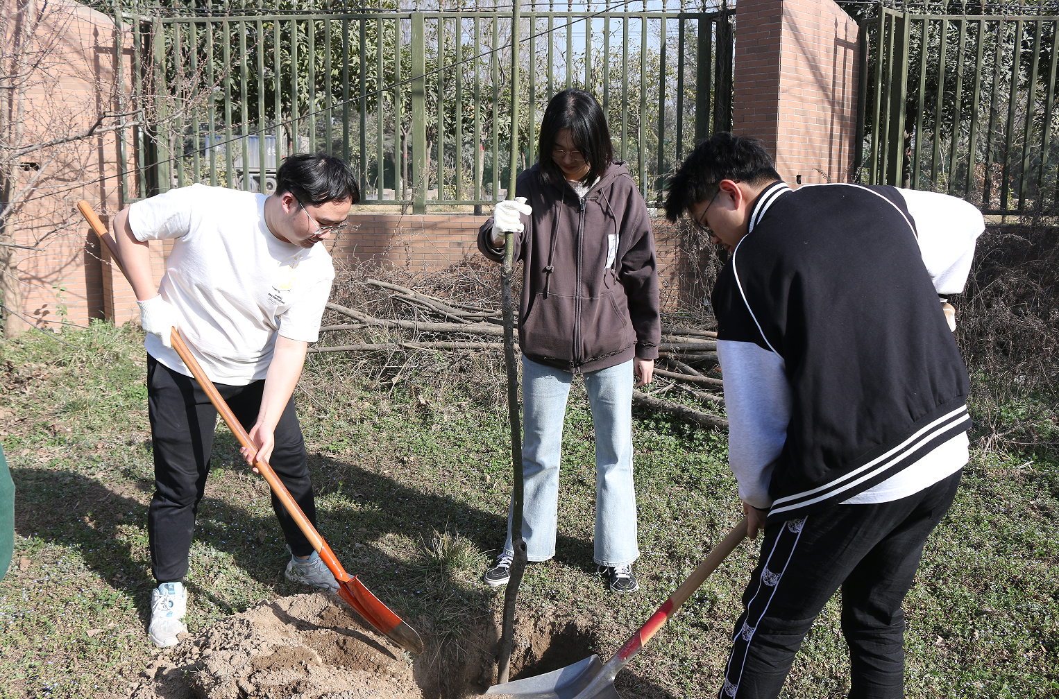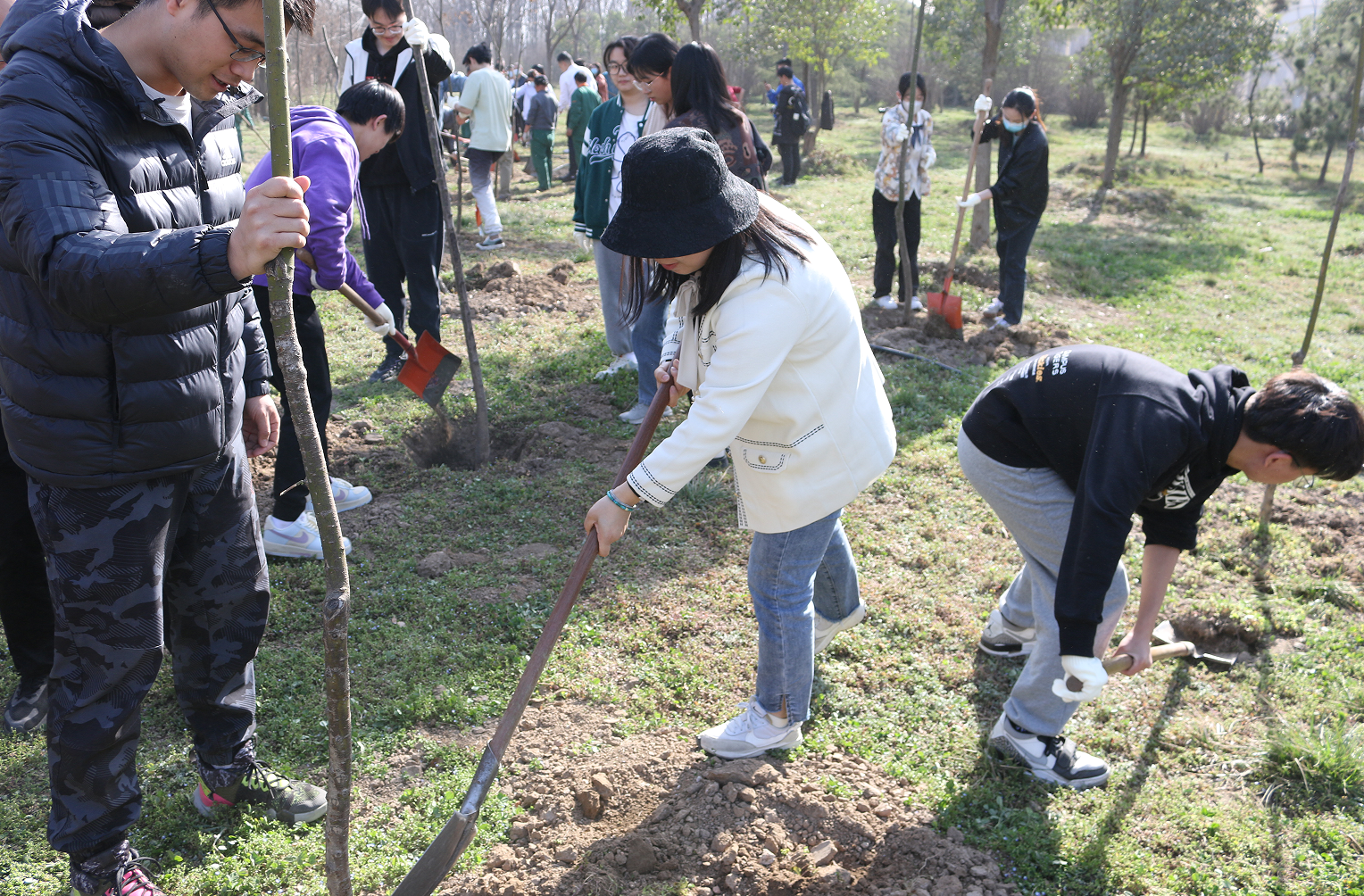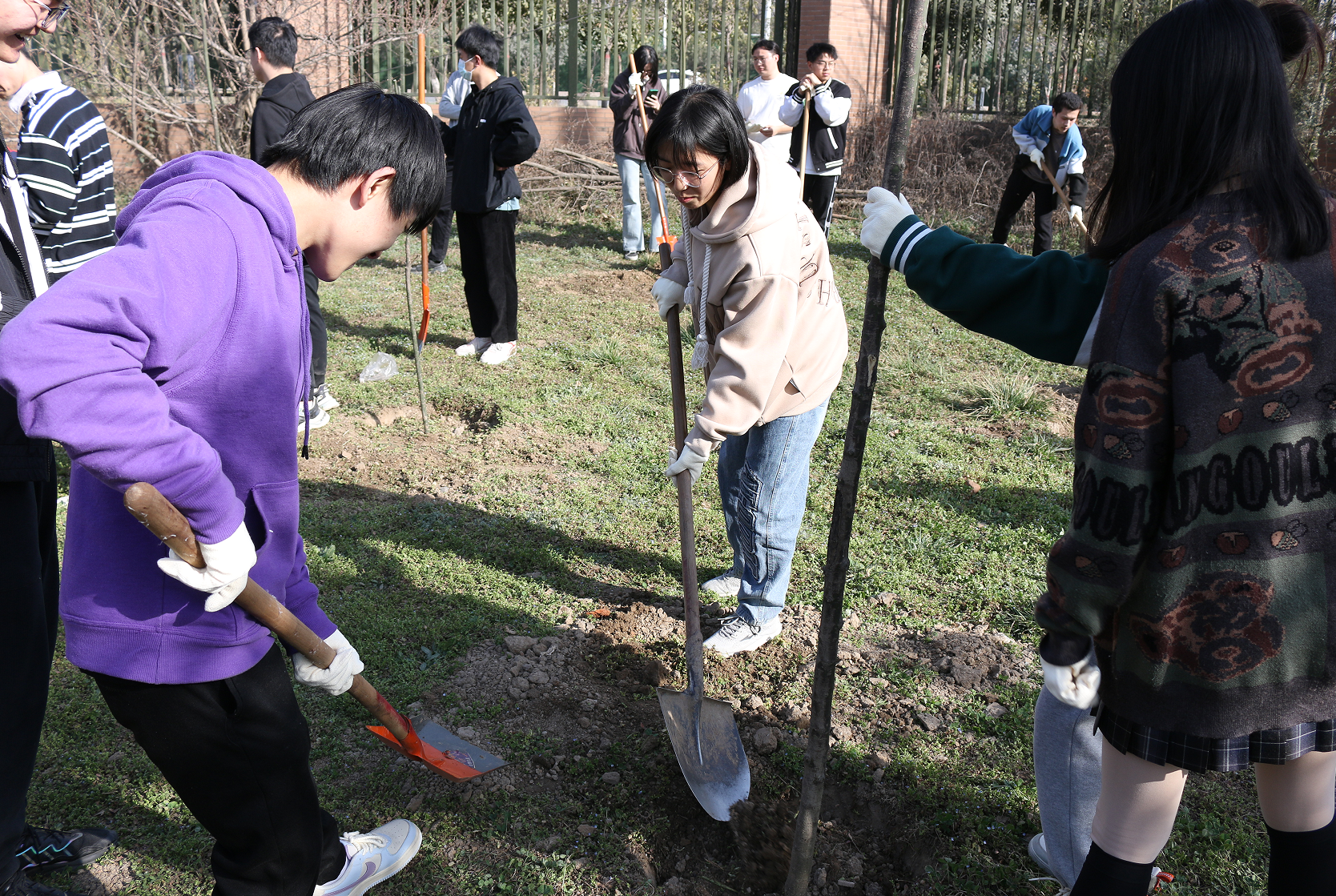 遠望谷體育館東側,在后勤保障部園藝老師的統籌安排下,同學們三五人一組,有序分工,熱情飽滿。大家一起揮動鐵鍬、培植厚土、扶正新苗,讓一棵棵樹苗在灌溉之下萌發新生。同學們紛紛表示這次活動十分有意義,增強了自我植綠、愛綠、護綠的意識,在身體得到鍛煉的同時,提高了自身的專業素養和動手能力。