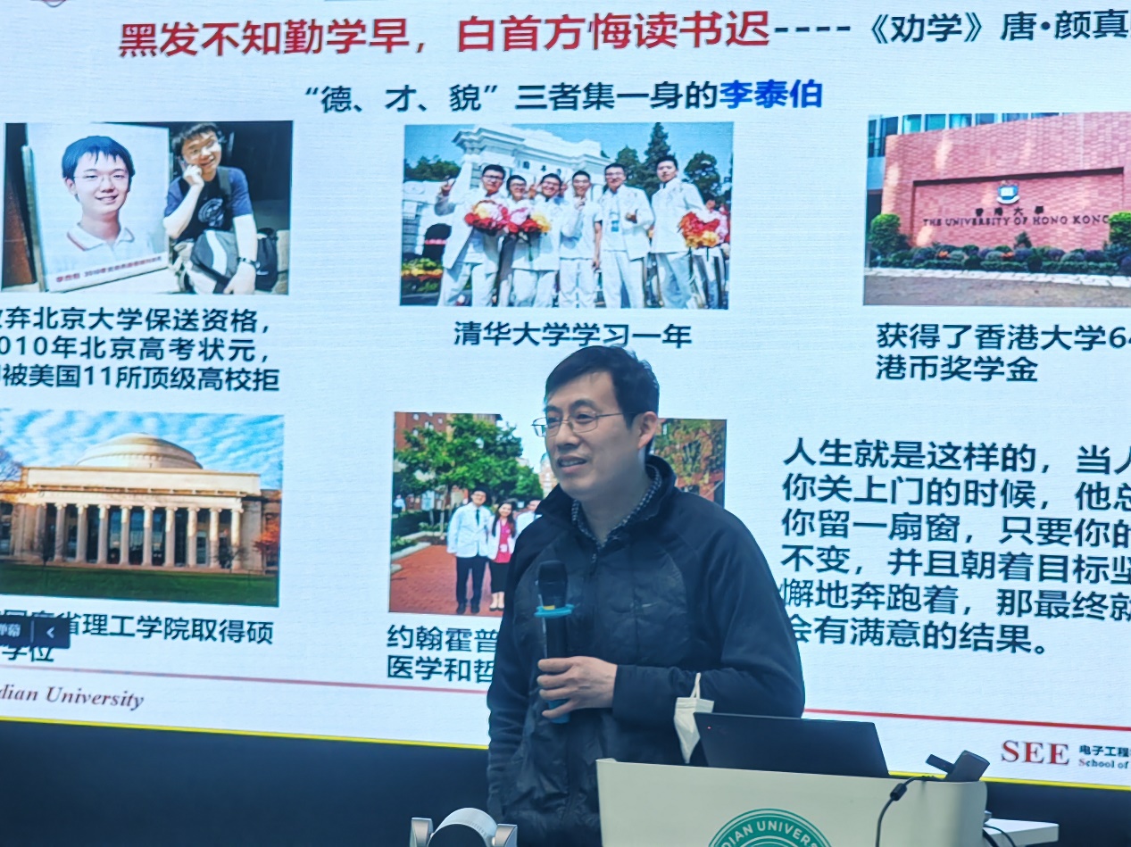 史琰教授作為電磁場與無線技術專業的負責人,向學生介紹了電磁場與無線技術專業的研究方向及涵蓋的領域。電磁場與無線技術專業涵蓋廣泛,與生物醫學、遙感探測、微波工程等學科都密切相關,專攻“卡脖子”技術,其對于我國科技發展的意義不言而喻。史琰教授還向學生展示了專業知識圖譜,介紹了學科發展歷史、師資力量、實驗平臺等相關內容,幫助學生進一步了解專業。最后,他以顏真卿的“黑發不知勤學早,白首方悔讀書遲”作為寄語,鼓勵同學們努力學習,做為國家做貢獻的新時代青年。