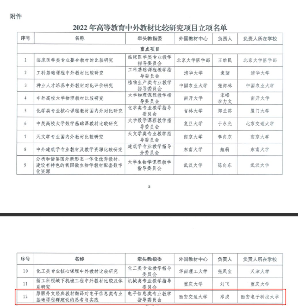 近日,教育部高等教育司公布了《2022年高等教育中外教材比較研究項目立項名單》,電子工程學院鄧成教授主持申報的《通過翻譯原版教材對電子信息類專業基礎課程群建設的思考與研究》獲批重點項目立項,全國僅12項,這是學校教學改革取得的又一進展。