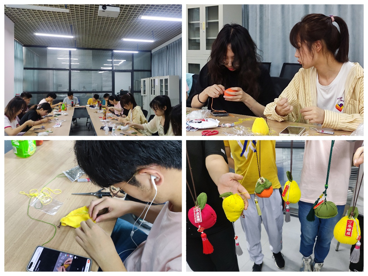端午節除了吃粽子、賽龍舟,佩戴香囊也是一個傳承了上千年的習俗。“端午香囊DIY”活動現場,艾草、布料、針線、配件等材料一應俱全,指導老師首先向同學們普及了端午節的起源、習俗以及香囊的制作方法,同學們一邊穿針引線制作香囊,一邊相互討論著縫制要點,現場氣氛融洽活躍。除了女同學外,活動也吸引了一批第一次接觸針線的男同學,他們拿著繡花針絲毫不馬虎,用生澀的手法穿針、系結、填棉花、裝艾草,一針一線雖不熟練、但很認真。在淡淡的艾草清香中,一個個小巧玲瓏、沁人心脾的香囊誕生了。男同學們不禁感慨:“做香囊太難了,細心、耐心一樣都不能少,能堅持縫制完成,是很大的挑戰!”看到自己辛苦的勞動成果后,同學們紛紛拿出手機拍照,分享給遠方的家人們。香囊縫制活動不僅為端午佳節營造了濃厚的氛圍,更傳承和弘揚了香囊制作這一傳統習俗。