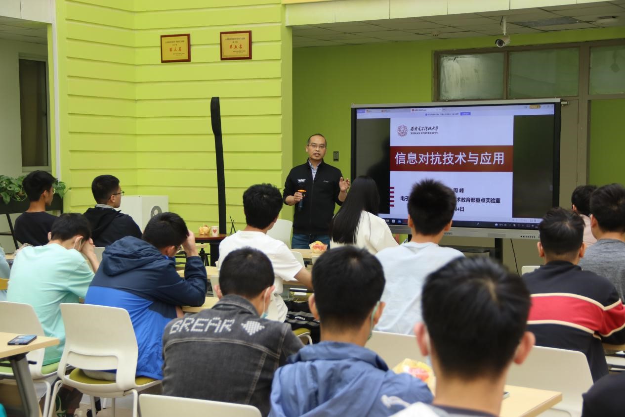 周峰教授以“電子信息對抗與技術”為主題,結合自身雷達及雷達對抗研究經歷,圍繞信息對抗發展現狀、目前面臨的問題與挑戰、雷達博弈對抗技術內容及實驗室團隊介紹等方面,引導電子信息類學生了解海陸空天信息對抗技術現狀、雷達對抗的發展歷程及重要意義,比較了國內外信息對抗技術人才培養和技術研究等方面的區別,以產學研用四個維度分享信息對抗技術的效益與影響力,使現場同學們了解到電磁頻譜攻防技術是未來戰場的基礎和奪取勝利的法寶。周峰教授語言生動有趣,案例通俗易懂,其謙和的風度、淵博的學識、深刻的見解,讓在座學生受益匪淺。