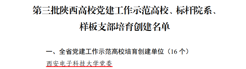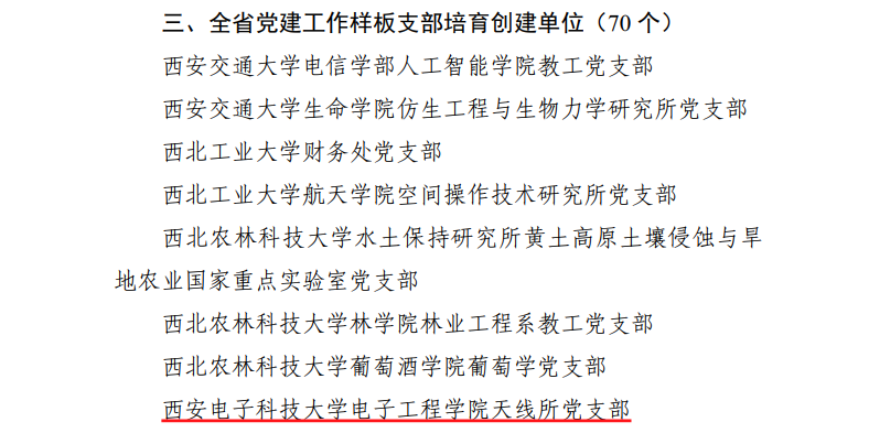 (通訊員:劉昕雨、鄧鑒)近日,中共陜西省委教育工委印發《關于公布第三批陜西高校黨建工作示范高校、標桿院系、樣板支部培育創建名單的通知》(陜教工函〔2022〕74號),電子工程學院黨委入選第三批陜西高校黨建工作“標桿院系”培育創建單位,天線所黨支部入選“樣板支部”培育創建單位。
