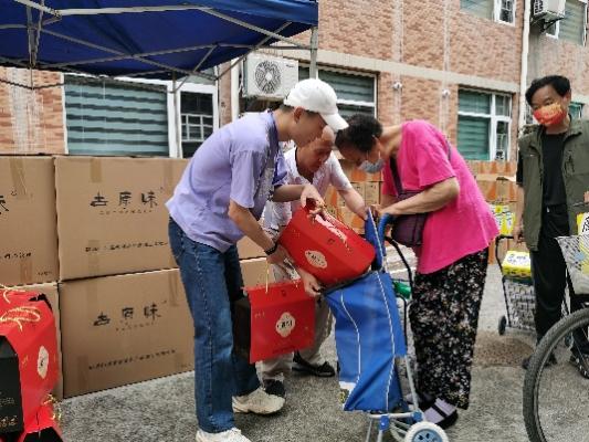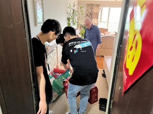 天色微蒙,突如其來的小雨絲毫沒有影響志愿者們的熱情。在現場工作人員的指揮下,同學們三兩一組,踏入雨中,把滿載節日祝福和物資的推車送到各位離退休老教師的公寓門前,受到了各位離退休教師的贊揚和感謝。