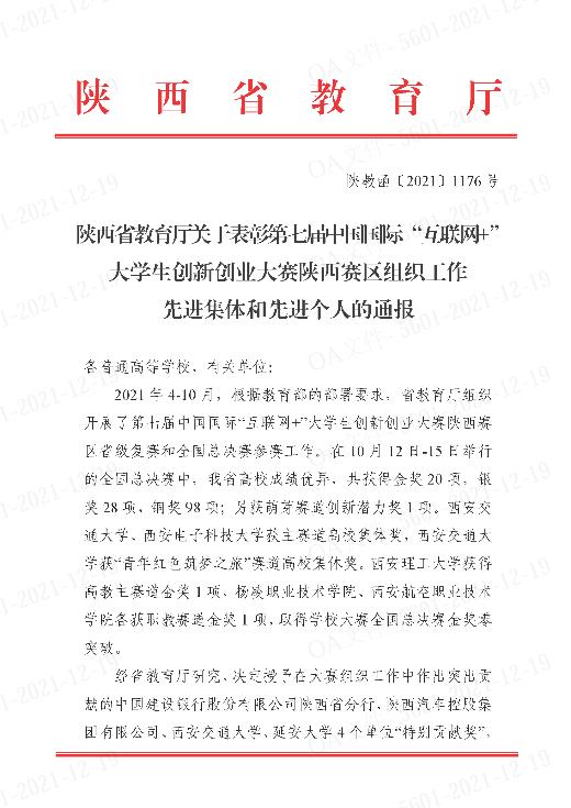 (通訊員 李雨煙 楊峻瑋)近日,陜西省教育廳發布《關于表彰第七屆中國國際“互聯網+”大學生創新創業大賽陜西賽區組織工作先進集體和先進個人的通報》,電子工程學院榮獲組織工作先進集體。