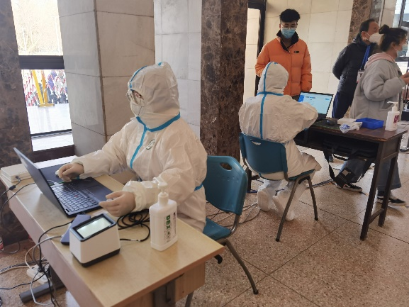 志愿者們有的穿上白色防護服成為“大白”,協助醫護人員核查數據,有的在排隊處引導同學們有序檢測。