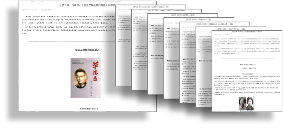 學院以建校90周年為契機,開辟“禮贊九秩、傳承初心”專欄,將學院專業建設者和校友事跡作為“三全育人”的鮮活教材、生動樣本,通過網站和微信公眾號發布《雷達工程教育的奠基人畢德顯》《頂天立地、求真務實的“雷達裁判長”保錚》《居高聲遠,躬身篤行—國家教學名師梁昌洪》《難忘激情燃燒的歲月—孫肖子》《電院84級校友張榮橋的家國情懷》等10余篇事跡材料,凝聚共識,激勵師生傳承老一輩西電人堅定信念、砥礪奮進、科研強國的情懷與擔當,團結拼搏,沖刺雷達、信息、電子工程的制高點。