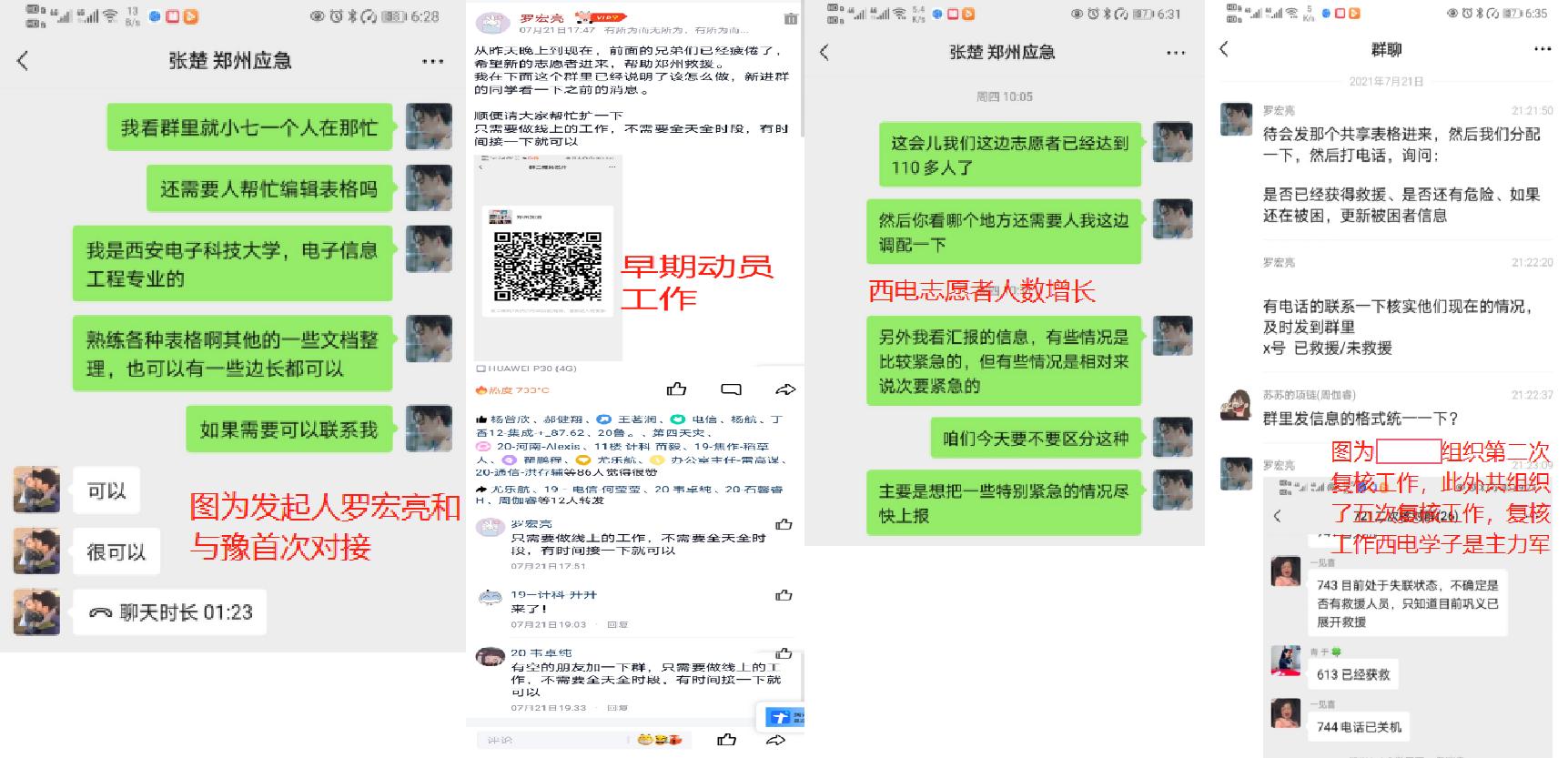 隨后,羅宏亮通過QQ空間和微信朋友圈發布倡議,希望更多的西電學子可以加入到河南汛情志愿服務工作中。發出倡議后,參與志愿服務活動的信息迅速在西電學子中擴散。截至7月21日晚,80余位西電學子迅速加入到“與豫”志愿者團隊,并且建立起原始信息錄入、求助信息電話核實、反饋信息錄入、早期求助信息再核實、各類信息上報的閉環流程。志愿者團隊采取輪班制,24小時不間斷工作,除了凌晨的兩三個小時的休息時間,每個環節都有西電學子在工作,當時已經記錄核實并上報1400余條求救信息。
