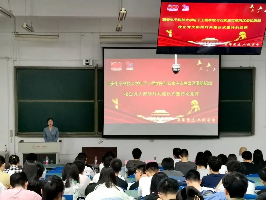 儀式中,西安電子科技大學電子工程學院2018級黨支部學生代表與鹿泉區委組織部代表互授校企黨支部結對共建合作錦旗,鹿泉區委組織部一行向學生支部贈送了黨旗、黨章、黨徽。
