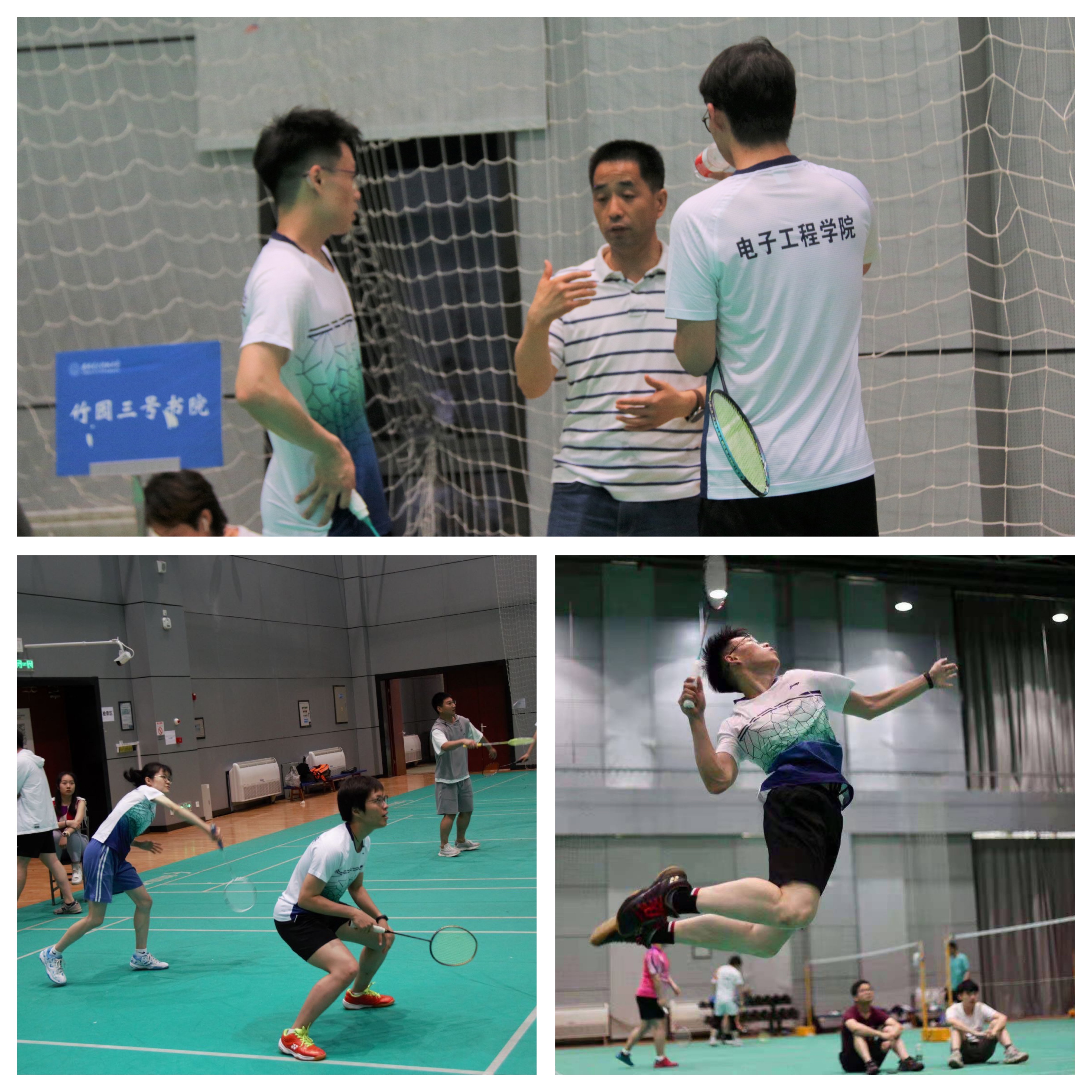 本屆比賽均采用五場三勝制,每場三局兩勝,每局21分。比賽的出場順序為:男單、女單、男雙、女雙、混雙。在運動場上電院健兒精力充沛,信心十足,每一場比賽都以飽滿的熱情,認真對待。勝不驕,敗不餒,彰顯電院學子的風采。賽前,運動員們與同伴互相切磋,交流對戰思路技巧;賽中,隊友們相互鼓勵,默契配合,學院黨委副書記劉建鋒也和運動員們一起分析對方的打法,進行現場的指導,陪伴著參賽隊員,在大家共同的努力下,電子工程學院代表隊取得了最終的勝利。