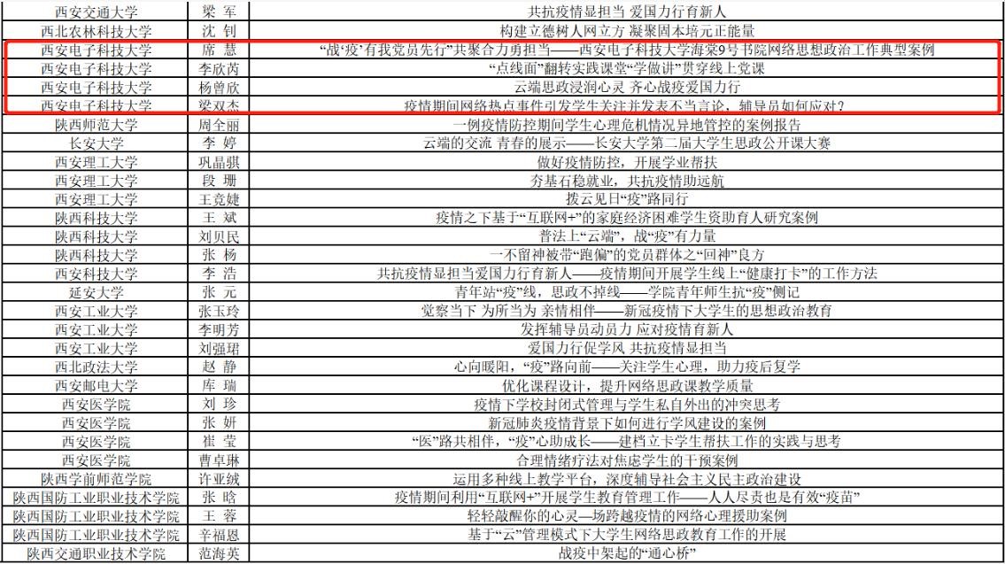 據悉,本次活動由陜西高校網絡思想政治中心組織,以“共抗疫情顯擔當 愛國力行育新人”為主題,共收到省內41所高校的207件作品,最終決出一等獎5項、二等獎10項、三等獎20項、優秀獎30項,我校共有9名輔導員獲獎。