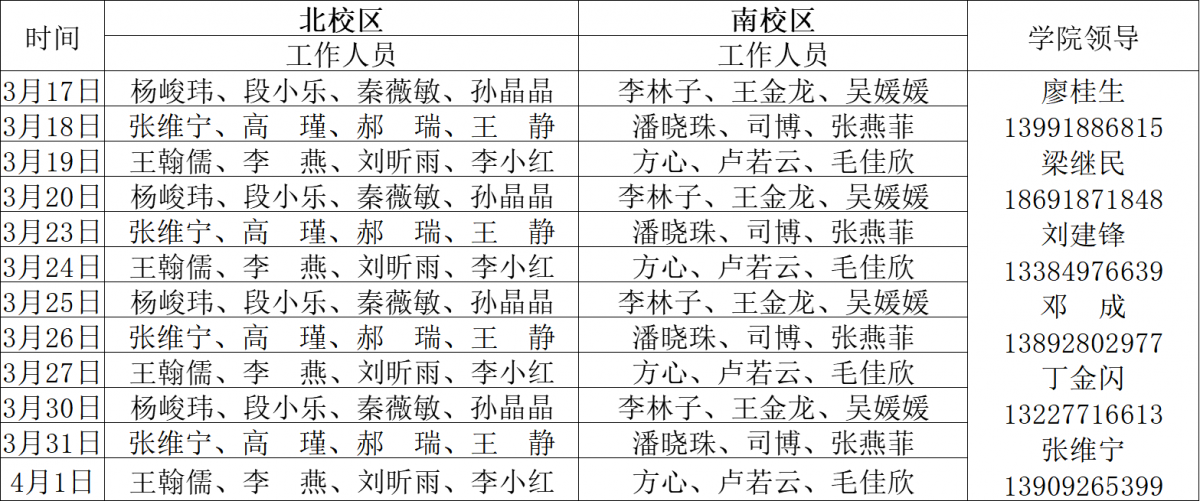 從3月17日起,學院機關已全面恢復現場辦公,學院領導和管理人員帶頭示范,在工作期間凡有身體不適者聯系辦公室主任楊峻瑋調整工作時間。居家辦公的人員必須保持手機暢通,如有相關工作需要,隨時來校到崗處理解決。工作期間做好環境衛生的消毒防疫工作,并做好個人的防疫保護工作。