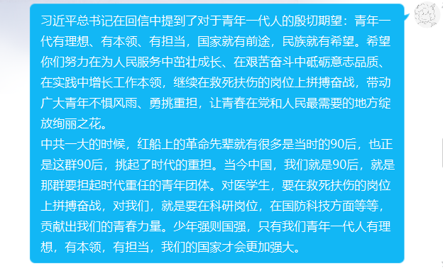 電院團委信息部負責人史庭磊說到:“在這次疫情中,涌現出了無數的英雄,他們逆流而上,沖鋒在疫情的第一線,他們與疫情賽跑,與病魔較量,為無數的人們帶去健康,在這其中,九零后展示出了他們自己的力量,為我們展示了青春一代的蓬勃生機,同時我們要學習他們的精神,做到腳踏實地,堅定不怕苦不怕犧牲的信心,將人民群眾的需求放在第一位。最重要的不是幾零后,而是‘努力后’、‘奮斗后’,能夠到祖國最需要的地方去,能夠為國家做貢獻,為人民服務,才是實現人生價值最好的途徑。每個人都有自己的任務,我們也要在我們的位置上做好我們自己,為祖國和人民做出貢獻,奉獻我們的青春力量。”