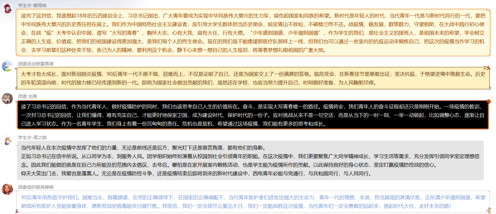(通訊員:劉昊 張校煜)“中共一大時,作為13位一大代表之一,毛澤東只有28歲,這也是13位中共一大代表的平均年齡,正是這群年輕人,挑起了那個時代的重擔;今天的90后,與那時的先輩年齡相仿,也要勇挑新時代重擔,貢獻出我們的青春力量。少年強則國強,只要我們青年一代人有理想、有本領、有擔當,我們的國家就會更加強大!”電院團委書記助理孟嵩皓同學在學習完總書記回信后激動的說。3月17日,電子工程學院團學組織的30余名團學骨干在線集體學習了習近平總書記給北大援鄂醫療隊全體“90后”黨員的回信精神,氣氛熱烈。