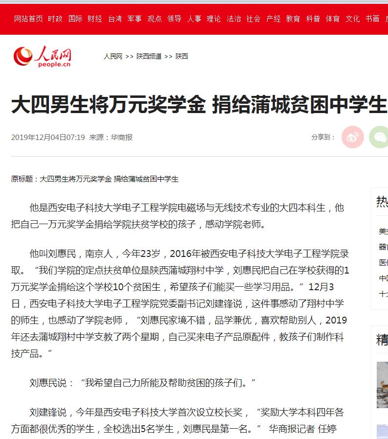 學院在每年畢業班就業季開展基層就業專題教育,宣講精準扶貧政策,講述西電人在蒲城縣助力脫貧故事,引導廣大畢業生到西部基層就業,取得了一定成效。學院2017屆畢業生劉坤麗、2019屆畢業生張振鋼參加志愿服務西部計劃;學院2018屆畢業生王琳珠參加研究生支教團項目;學院2019屆畢業生鄒寶利、張燦參加選調生計劃到貴州基層就業,一批批電院學子以實際行動參加到基層一線的脫貧攻堅事業中。特別值得一提的是,在學院的教育引領下,學院2016級本科生劉惠民自愿捐出10000元獎學金資助蒲城翔村中學10名貧困學生。