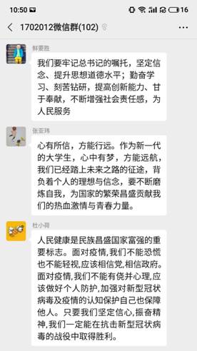 電子信息工程專業高英杰說:“疫情爆發以來,黨中央高度重視,號召全國各族人民同舟共濟、合力擔當,堅決打贏抗‘疫’的人民戰爭、總體戰、阻擊戰,全力以赴保護人民的生命健康安全。全國各地統一行動、積極舉措,在全力支援武漢等疫情重災區的同時,廣泛動員干部群眾清醒認識當前的嚴峻形勢,寧可‘十防九空,不可失防萬一’,‘把疫情防控工作作為當前最重要的工作來抓’,盡銳出戰,務實擔當,堅決徹底地打贏這場我們必須要贏的戰役。”
