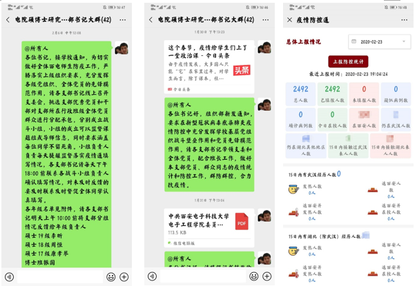 疫情初始,電子工程學院迅速成立電院研究生疫情防控工作小組,研究生全體班委在第一時間投入疫情防控工作,及時認真傳達學校相關政策文件,協助學院開展心理疏導工作,配合輔導員對疫情嚴重地區同學開展一對一關懷工作,排查全體同學所在位置、寒假期間身體狀況和返鄉途中接觸情況,全體同學堅持每日向班委報平安制度,在“疫情通”上線之前有效完成全體同學健康狀況的排查統計工作。