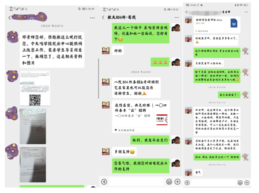 延遲開學對未就業的畢業生帶來更大的心理壓力,電子工程學院研究生輔導員進一步梳理未就業同學近況,積極聯系各用人單位拓寬就業渠道,為學院未就業同學提供線上指導和就業幫扶,全力做好用人單位和畢業生的橋梁工作。積極配合上級部門工作安排,提供全天候線上就業指導和審批工作,盡最大努力將疫情帶來的影響降到最低。