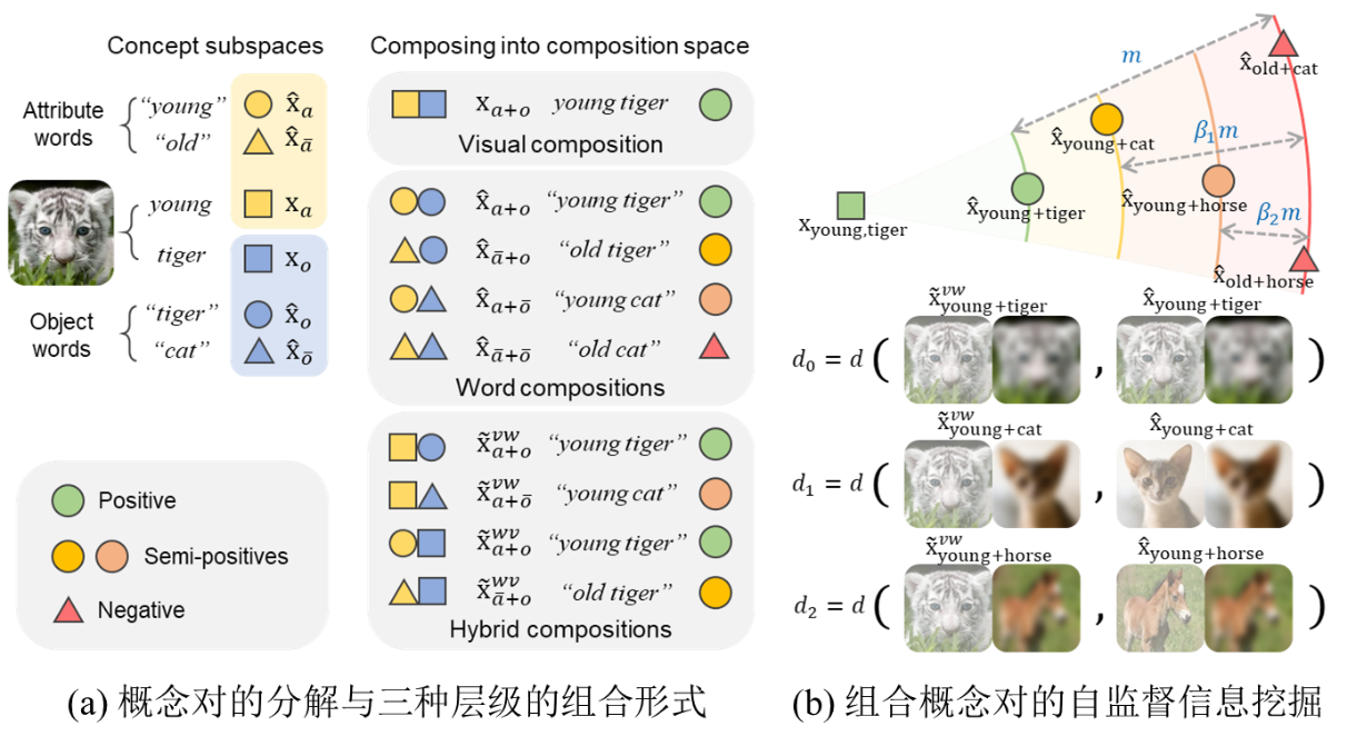 楊木李博士的論文“Learning Unseen Concepts via Hierarchical Decomposition and Composition”提出了一種全新的“分而治之,治而合之”的學習策略以解決未知概念對的識別問題。該方法首先將已知概念對的圖像輸入拆分為單個概念的視覺特征,然后在語義空間中與其他概念的文本特征組合為具有三種層級結構的概念對。通過進一步挖掘隱藏在這些概念對中的自監督信息,自適應地調控不同概念對之間的距離關系,實現已知概念向未知概念的知識遷移,有效提升未知概念對的識別能力。