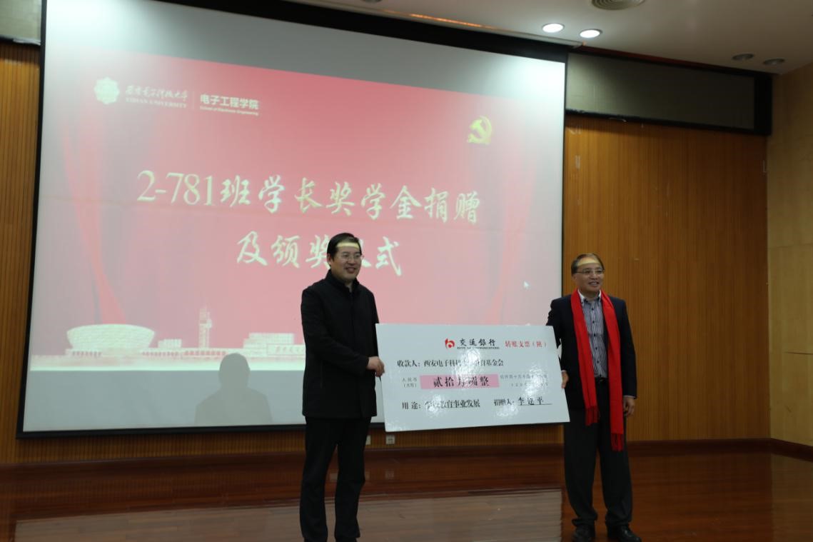 2-781班校友們在2018年重返母校之際決定捐資設立“2-781班學長獎學金”,以此回饋母校,助力學子成長成才。今年的愛心捐贈,讓溫暖延續,第二期獎學金20萬元由2-781班李建平校友捐贈。李建平校友在發言中提到,2-781班大部分同學都已在自己的工作崗位上發光發熱,為國家做出了突出貢獻。他說每位同學的成功與所處的時代有關,與母校雷達工程專業在國家的地位有關,與個人成長的經歷有關, 2-781班優秀校友有中國電科14所首席專家、國家多項重大工程總師楊廣平,南京中電熊貓信息產業集團有限公司監事會主席虞炎秋等等。他說成功的經驗就是踏踏實實,在一個崗位上干到底、不放棄,堅持下來,設立獎學金目的也是希望能夠將腳踏實地的西電學長精神傳承并發揚下去。副校長高新波接受捐贈并向李建平校友頒發捐贈證書。