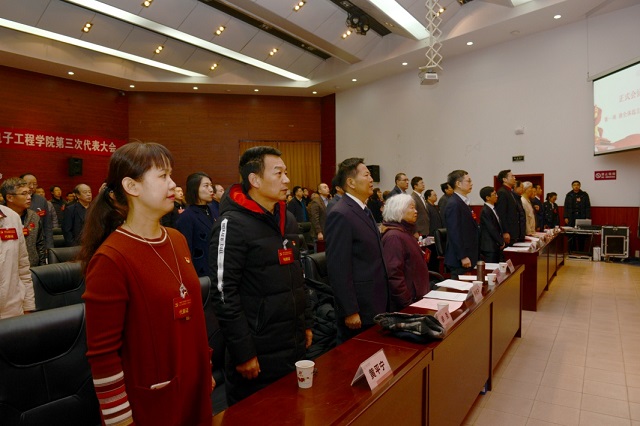 上午9時,在雄壯的樂曲聲中,全場起立,高唱《中華人民共和國國歌》。主席臺上方懸掛著“中國共產黨西安電子科技大學電子工程學院第三次代表大會”的會標,后幕正中鐮刀和錘頭組成的中國共產黨黨徽熠熠生輝,十面鮮艷如火的紅旗分列兩側,映照得整個會場莊嚴明麗。