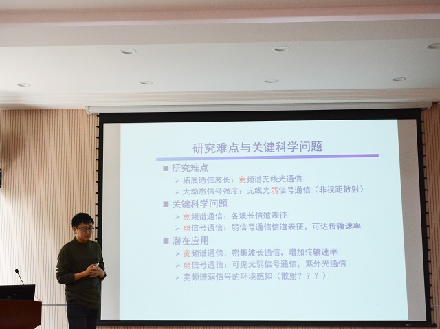 會上,首先由龔晨教授作了題為“無線光弱信號特性研究”的報告。他結合無線光通信以上兩個信道信號特點,給出了寬光譜關聯特性以及弱信號下的“非線性、非加性、非高斯、雙隨機性”的信號刻畫。