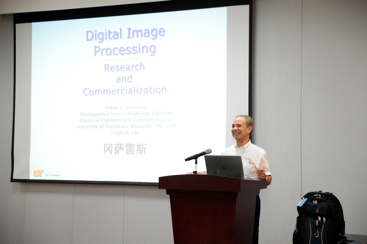 6月12日下午,在主樓III區430報告廳,Gonzalez教授作了題為“Digital Image Processing Research& Commercialization”的學術報告。,報告會由電子工程學院影像處理實驗室韓冰副教授主持,來自西北工業大學,西安交通大學以及西安電子科技大學電子工程學院,計算機學院,通信工程學院,人工智能學院的200多名師生參加了報告會。