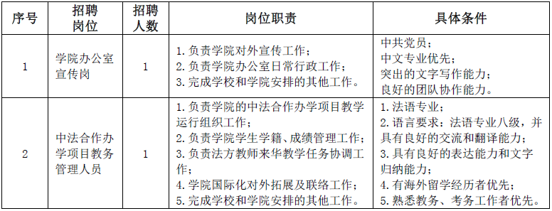 1.學歷要求。學院辦公室宣傳崗要求碩士及以上學歷;中法合作辦學項目教務管理人員要求本科及以上學歷。