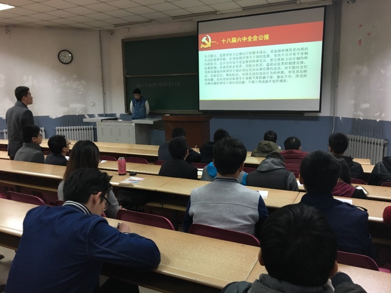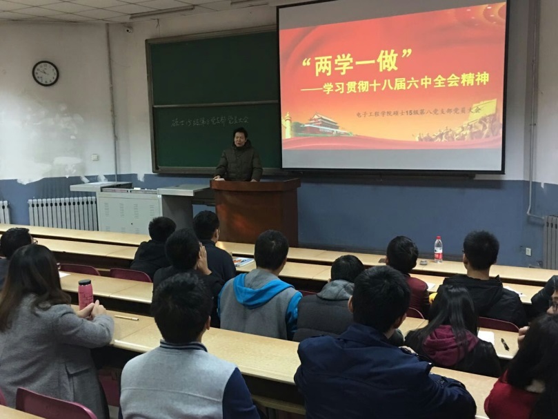 (通訊員:羅鑫帥 劉昕雨)2016年11月15日下午3點,電子工程學院黨委書記徐克同碩士15級第八黨支部的黨員同志一同學習了黨的十八屆六中全會內容,電子工程學院碩士15級第八黨支部書記羅鑫帥同志主持了本次學習研討會。