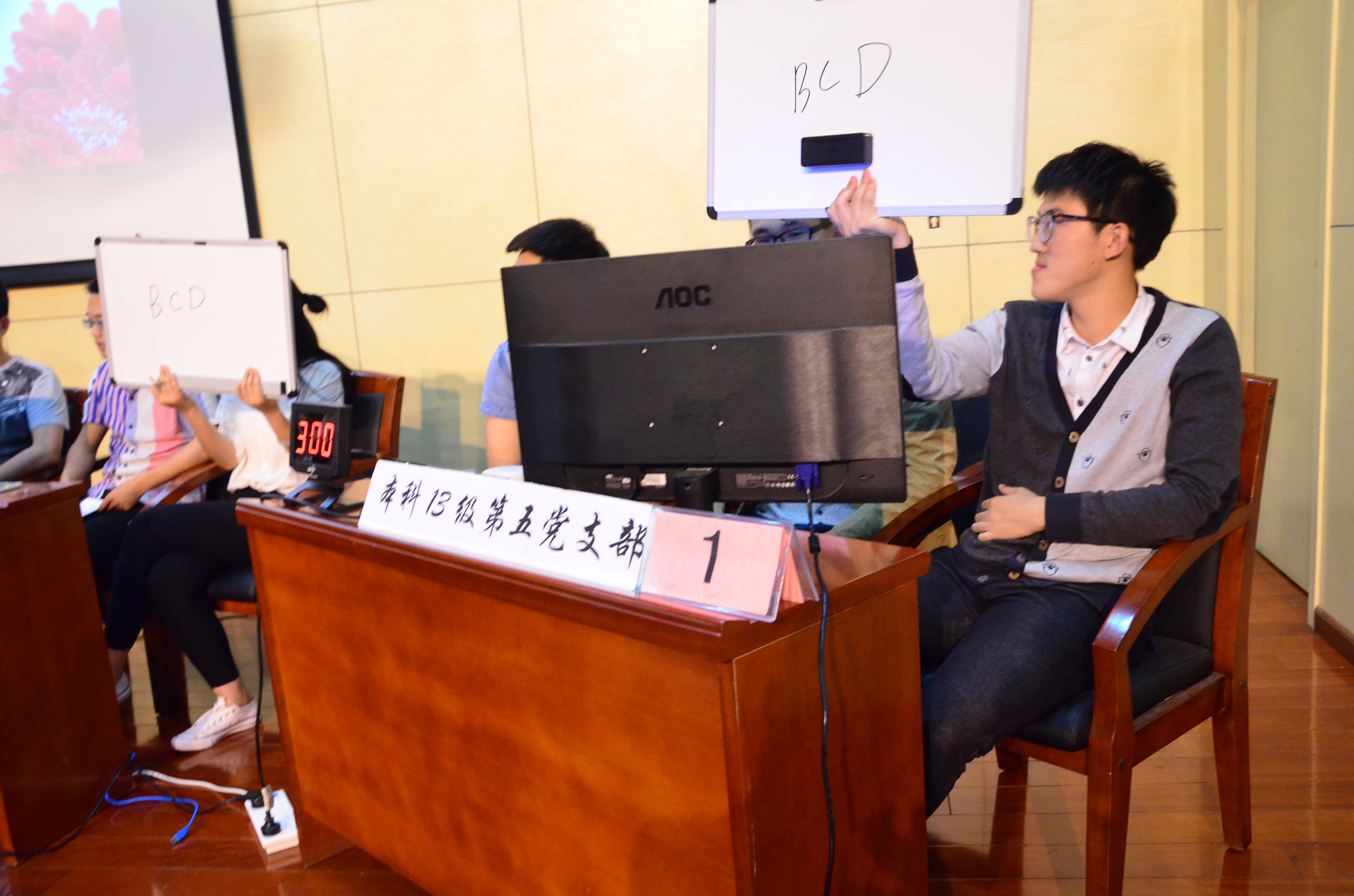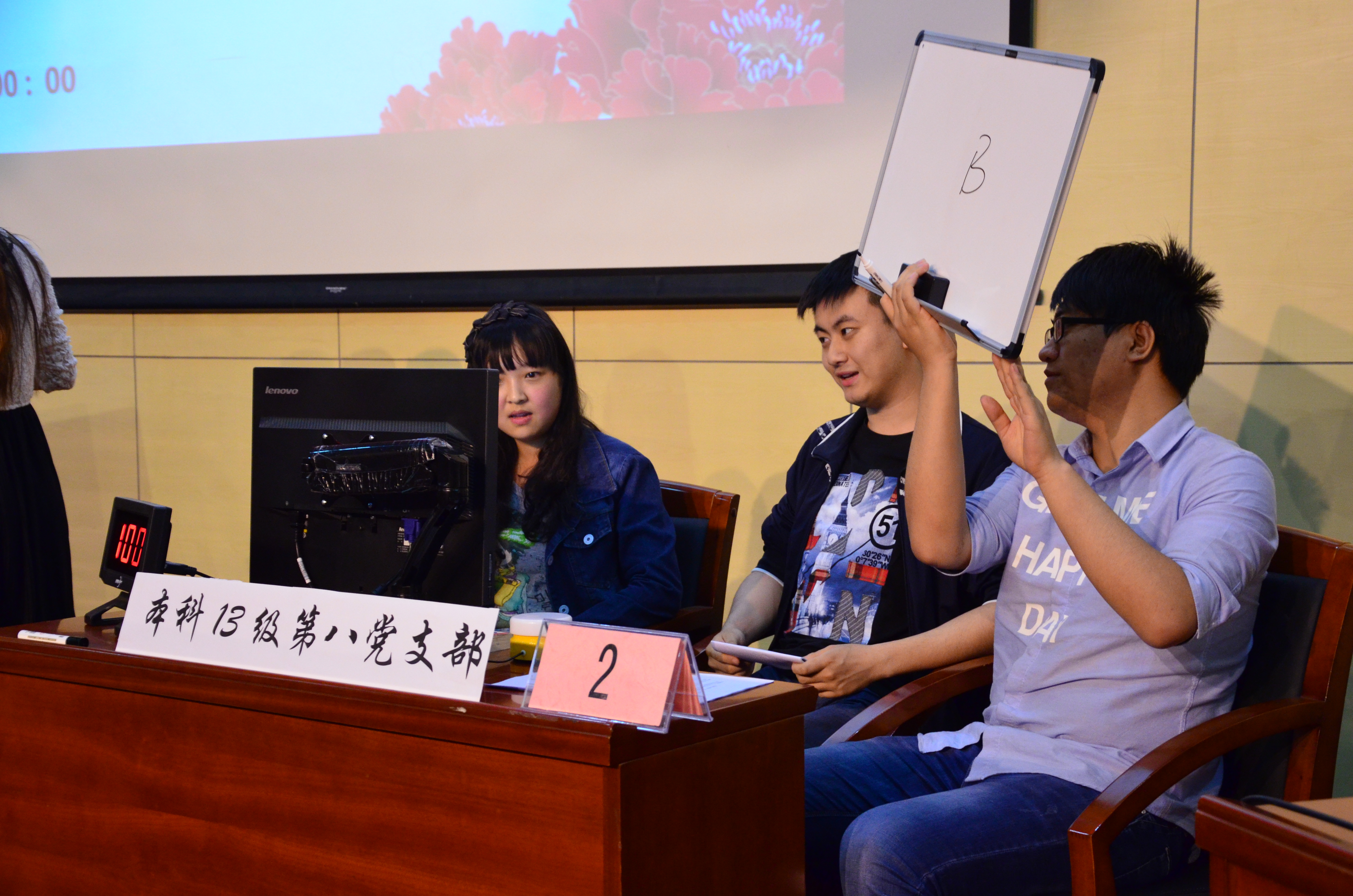 本場晉級賽分為共答題和搶答題兩輪進行,兩輪累計得分最高的三支代表隊可以晉級半決賽。在共答題環節,各支部代表隊均能提前于規定時間作出答案,且正確率居高不下,全場觀眾掌聲不斷。搶答環節變得更加緊張激烈,各支部代表隊均發揮了自己強勁的實力,由于各代表隊準備充分,比賽成績一時難分上下。經過幾輪激烈的角逐,共有三支隊伍總分并列第三,最終,按照比賽賽制要求,競賽組織人員通過附加賽以搶答的形式決出了最后一支晉級代表隊。為活躍比賽氣氛,現場還設置了觀眾互動環節,在場觀眾積極踴躍答題,在贏得精美獎品的同時也獲得了陣陣掌聲。最終獲得晉級資格的代表隊分別是電院本科13級第7黨支部、電院本科13級第8黨支部和電院本科13級第5黨支部。