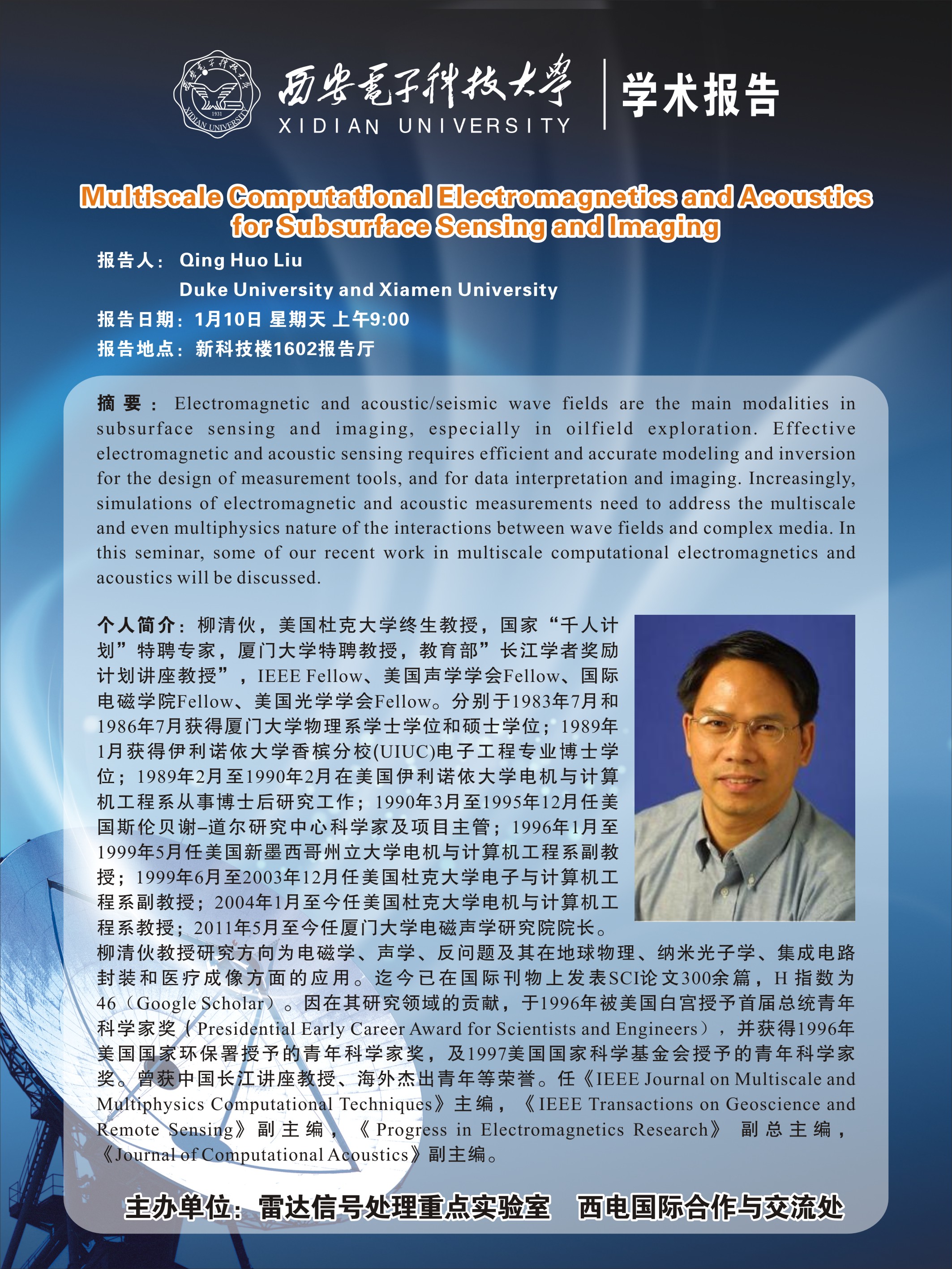 學術報告-Multiscale Computational Electromagnetics and Acoustics for Subsurface Sensing and Imaging 2016-01-06 15:35:00 瀏覽次數: 上一篇文章:電院科協舉辦“雙旦晚會” 下一篇文章:電子工程學院舉辦新年聯歡班級活動