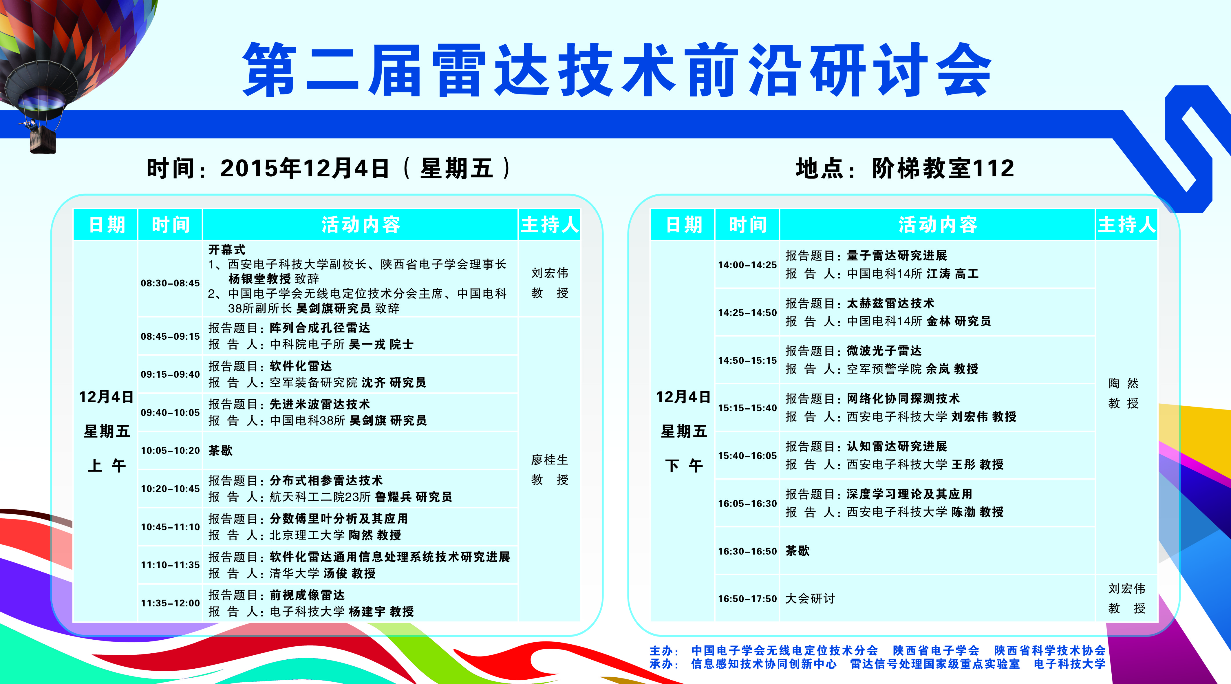 【會前新聞】第二屆雷達技術前沿研討會 2015-12-02 11:38:00 瀏覽次數: 經中國電子學會無線電定位技術分會批準,由雷達系統專委會、信號與信息處理專委會、陜西省電子學會及陜西省科學技術協會商定,將于2015年12月4日,在西安聯合舉辦“雷達新技術專題研討會”。會議主題為交流雷達技術研究進展,研討雷達技術發展前沿,展望雷達技術發展趨勢。本次會議特邀13位專家作特邀報告,學術報告之后,學術報告之后,特邀專家和參會代表將就雷達技術前沿相關議題進行研討。目前報名參會單位約50余家,正式代表約300余人。具體日程安排如下: 上一篇文章:【挑戰杯一等獎】眼球腦電波協控漸凍人輔助輪椅 下一篇文章:第二屆電磁場微波電路設計競賽獲獎名單