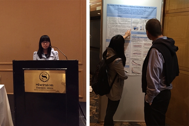 此次,高新波教授團隊的兩篇論文被該頂級會議接收,同時受邀在大會上做口頭報告外加墻報展示,這是西安電子科技大學在人工智能領域頂級會議上的新突破。以博士生王笛為第一作者的論文“Semantic Topic Multimodal Hashing for Cross-Media Retrieval”獲得了20分鐘的口頭報告和墻展交流。該論文聚焦多模態異質數據哈希編碼的離散特性,通過快速有效的挖掘圖像和文本數據中的隱含主題,并根據主題是否包含于數據之中得到離散哈希編碼,顯著提高跨模態信息檢索任務的精度。以鄧成教授為第一作者的論文“Multi-View Matrix Decomposition: A New Scheme for Exploring Discriminative Information”獲得了10分鐘口頭報告和墻展交流。該論文通過低秩和稀疏矩陣分解,設計了一種多視角的判別性信息融合框架,同時挖掘出了多視角數據的共性信息和個性信息,克服了現有模式分類方法中由于忽略單個視角特性而造成判別性不足的弊端,顯著提高了大規模多模態數據的分類精度。