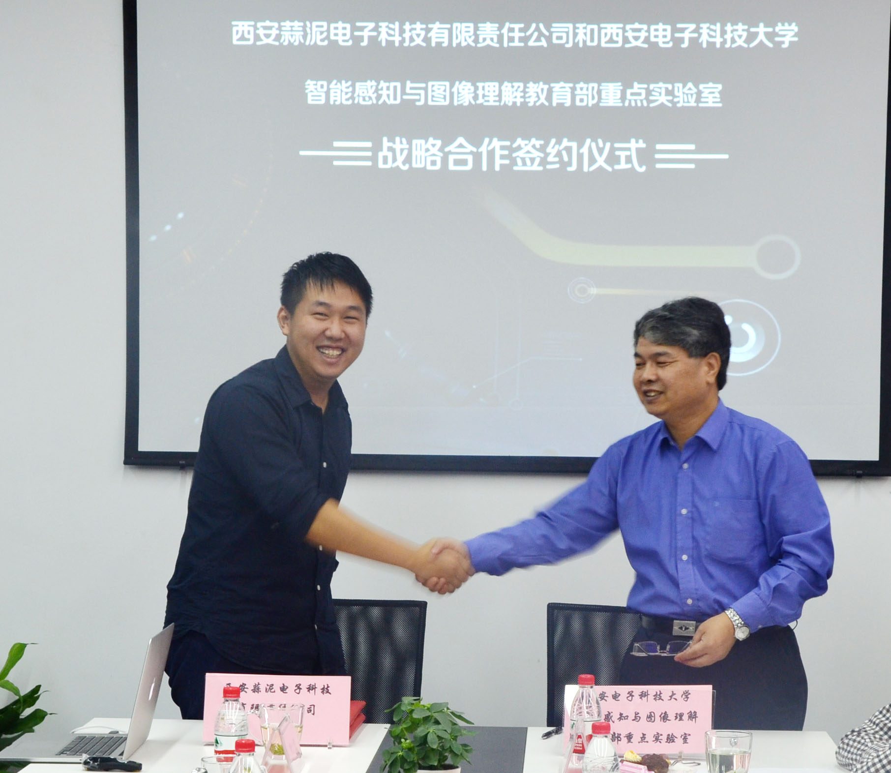 2015年9月12日,智能感知與圖像理解教育部重點實驗室與西安蒜泥電子科技有限責任公司在經開區蒜泥科技新址成功簽署戰略合作協議。西安電子科技大學校長助理高新波教授,西安電子科技大學組織部部長鄧卓峰教授,西安電子科技大學電子工程學院徐克書記,智能感知與圖像理解教育部重點實驗室主任焦李成教授,智能感知與圖像理解教育部重點實驗室副主任侯彪教授,智能科學與技術系主任鐘樺教授及高性能計算中心主任朱虎明副教授等,與經開區管委會巡視員段永和,經開區經發局生產力中心主任張亮進行了會面,一同對西安蒜泥電子科技有限責任公司進行了參觀考察,對其業務及發展情況作了詳細了解。