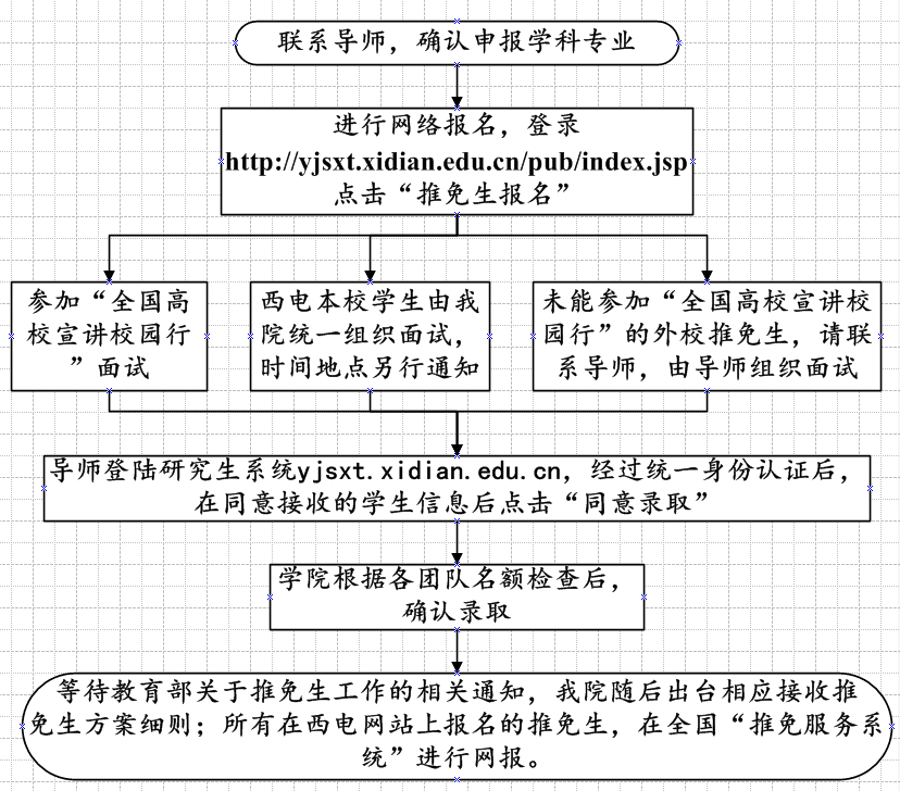 1)西安電子科技大學“優研計劃”宣講校園行活動獲接收函的推免生和通過我院導師團隊綜合面試的推免生:務必在9月29日18點前完成報考,并于30日18點前完成錄取確認。若未在規定時間內報考和確認錄取的推免生,所獲接收函和綜合面試結果無效。在規定時間報考和確認錄取的推免生,我院將給予第一學年一等學業獎學金,。